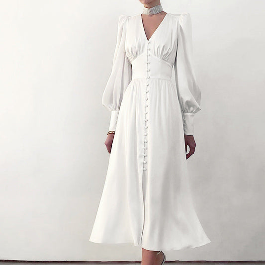 Franse Satijnen Midi Jurk met Ballonmouwen